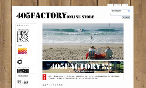 神奈川県保土ヶ谷に店舗を構えるサーフファッション405FACTORYのONLINESHOPを構築しました。HP、店舗のイメージをONLINESHOPにも反映しました。